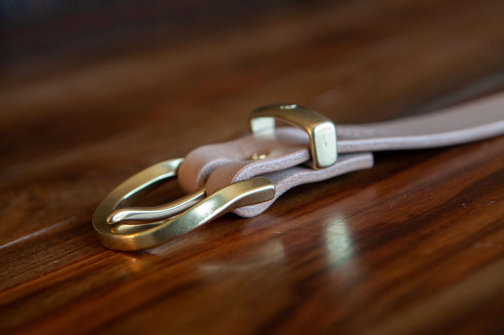 This is beefy hardware, with a thick prong, so it will only be available with Teardrop holes. Pretty much every leather I have on hand is available for selection, and I can't imagine a bad pairing with this hardware. Pictured with the Natural Japanese Bridle. After selecting your leather from the drop down menu, if applicable, please note your color alongside your measurement in the measurement box. EG: "37" green"
