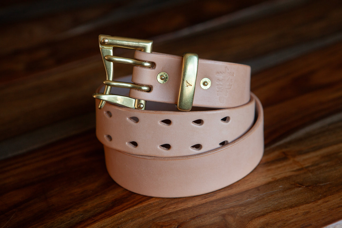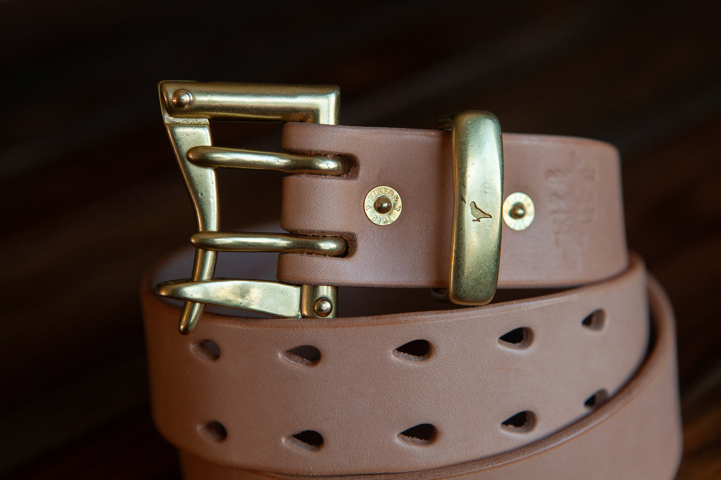 All quick release belts are made with teardrop holes, which besides the aesthetic difference, will allow the buckle to lie slightly more flat than a round hole, due to the oblong shape of the hole. Hardware will be secured with Pigeon Tree branded rivets for the brass option, while black nickel will be stitched with tonal thread, and nickel will be secured with nickel Chicago screws.