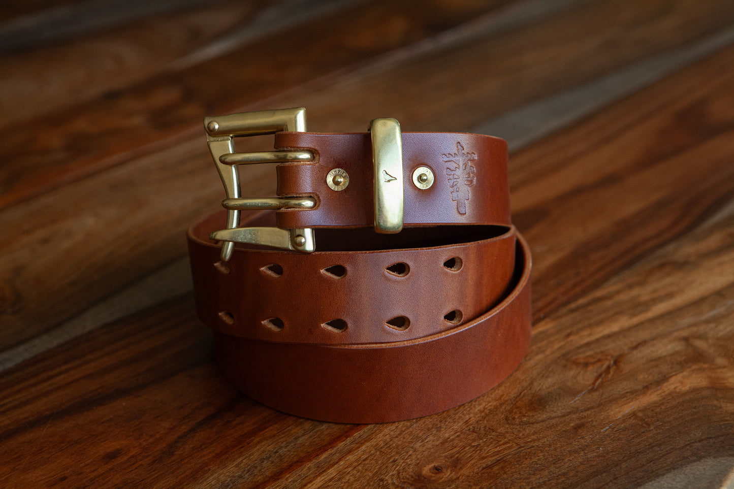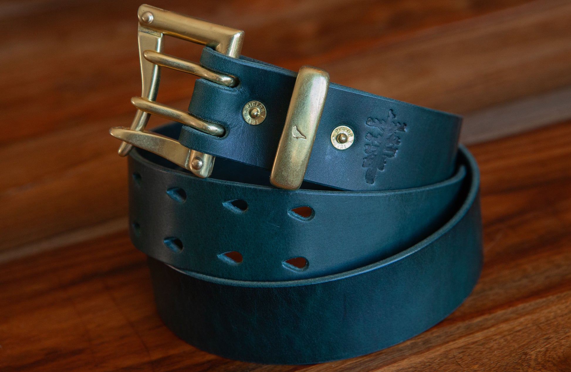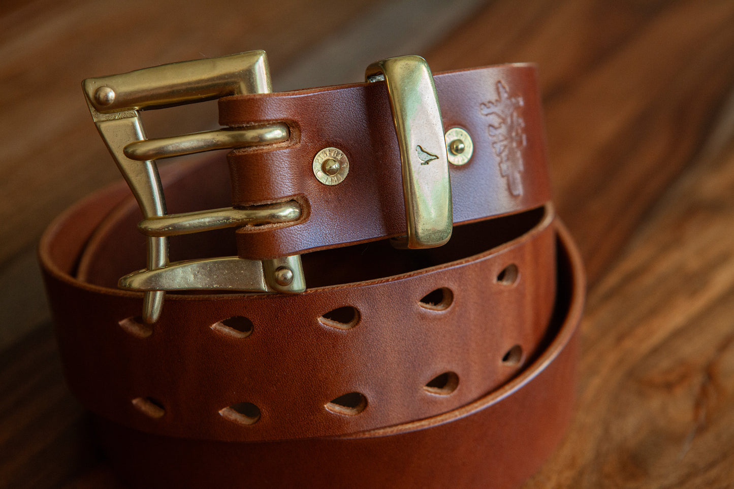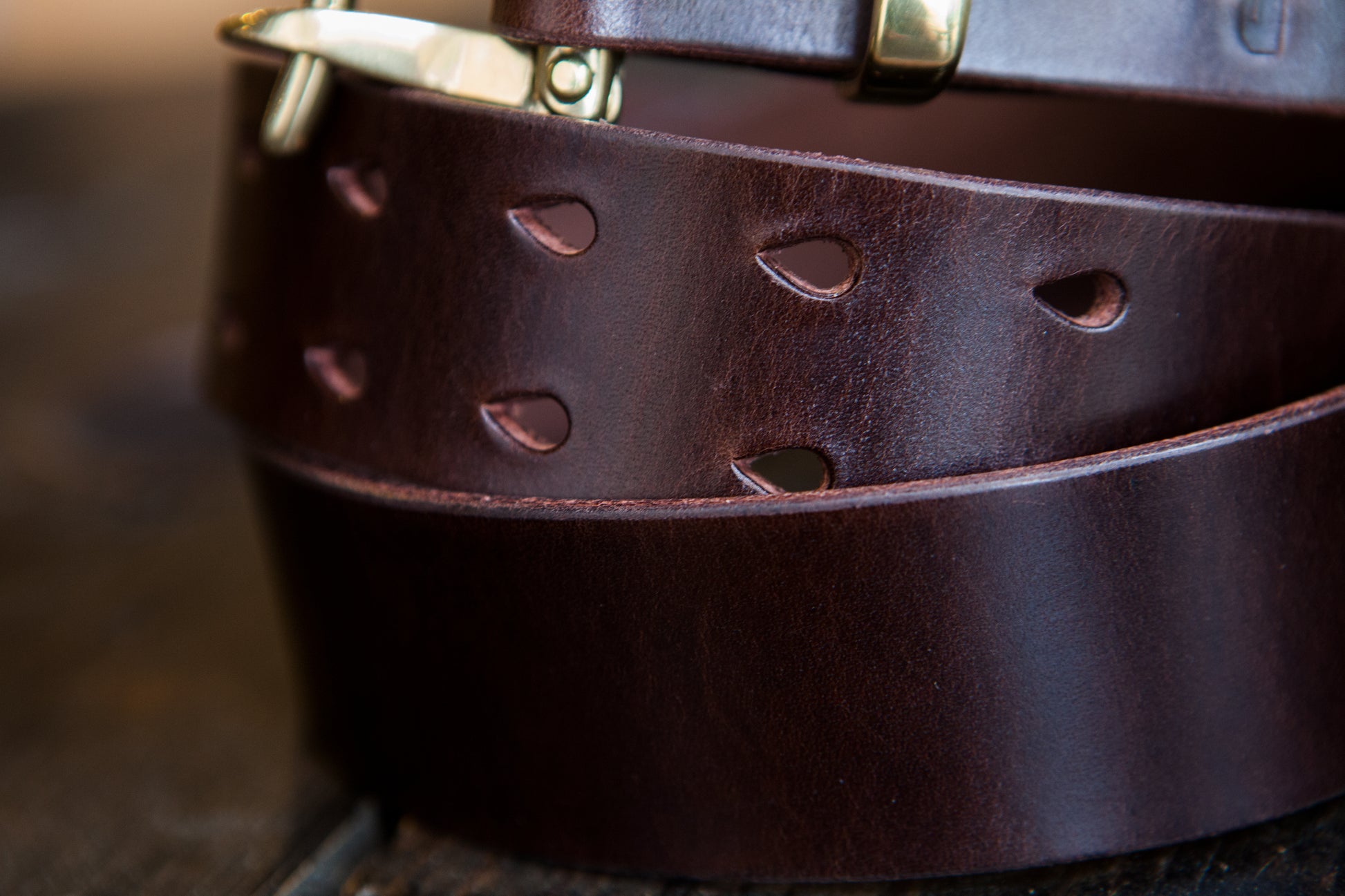 All quick release belts are made with teardrop holes, which besides the aesthetic difference, will allow the buckle to lie slightly more flat than a round hole, due to the oblong shape of the hole. Hardware will be secured with Pigeon Tree branded rivets for the brass option, while black nickel will be stitched with tonal thread, and nickel will be secured with nickel Chicago screws.
