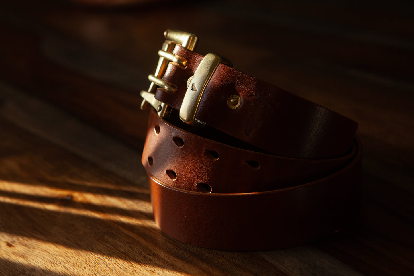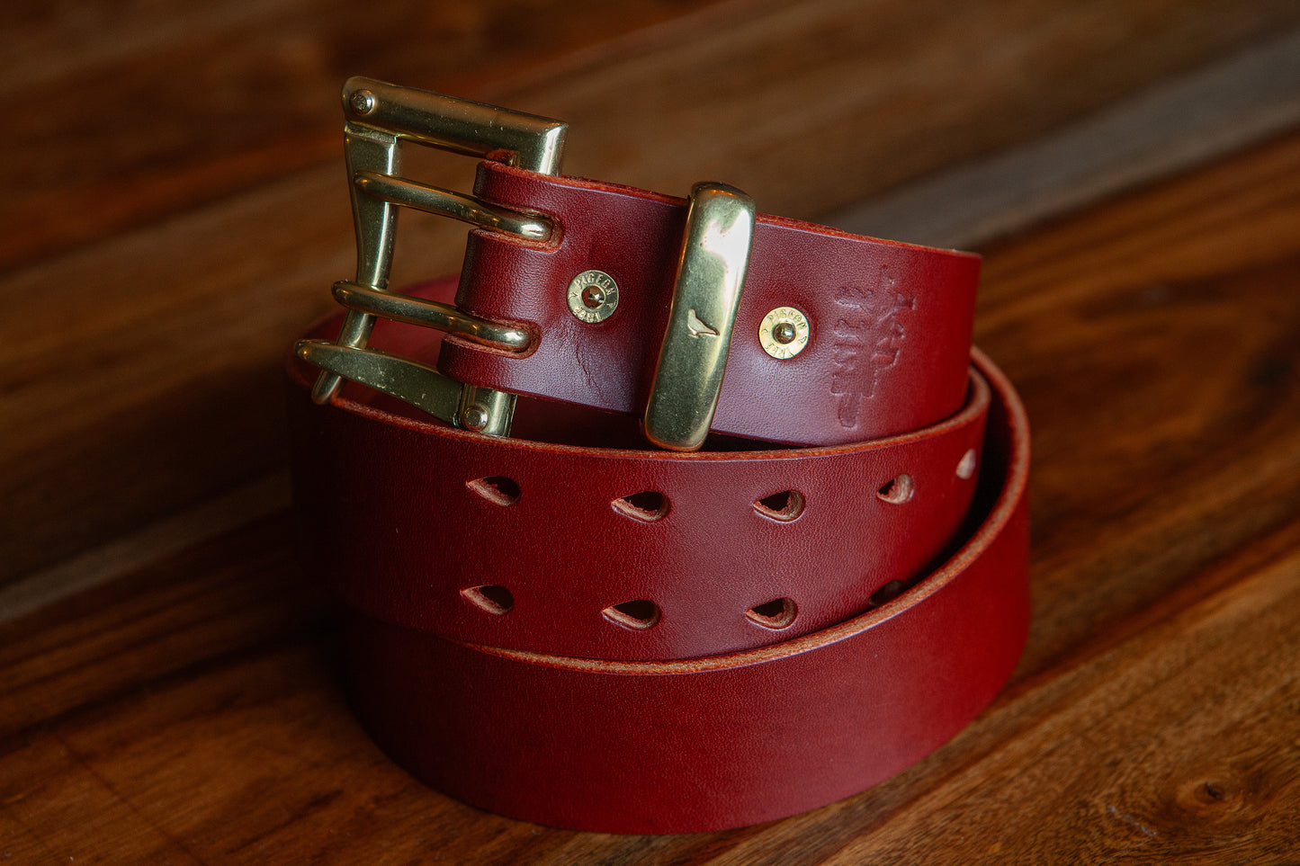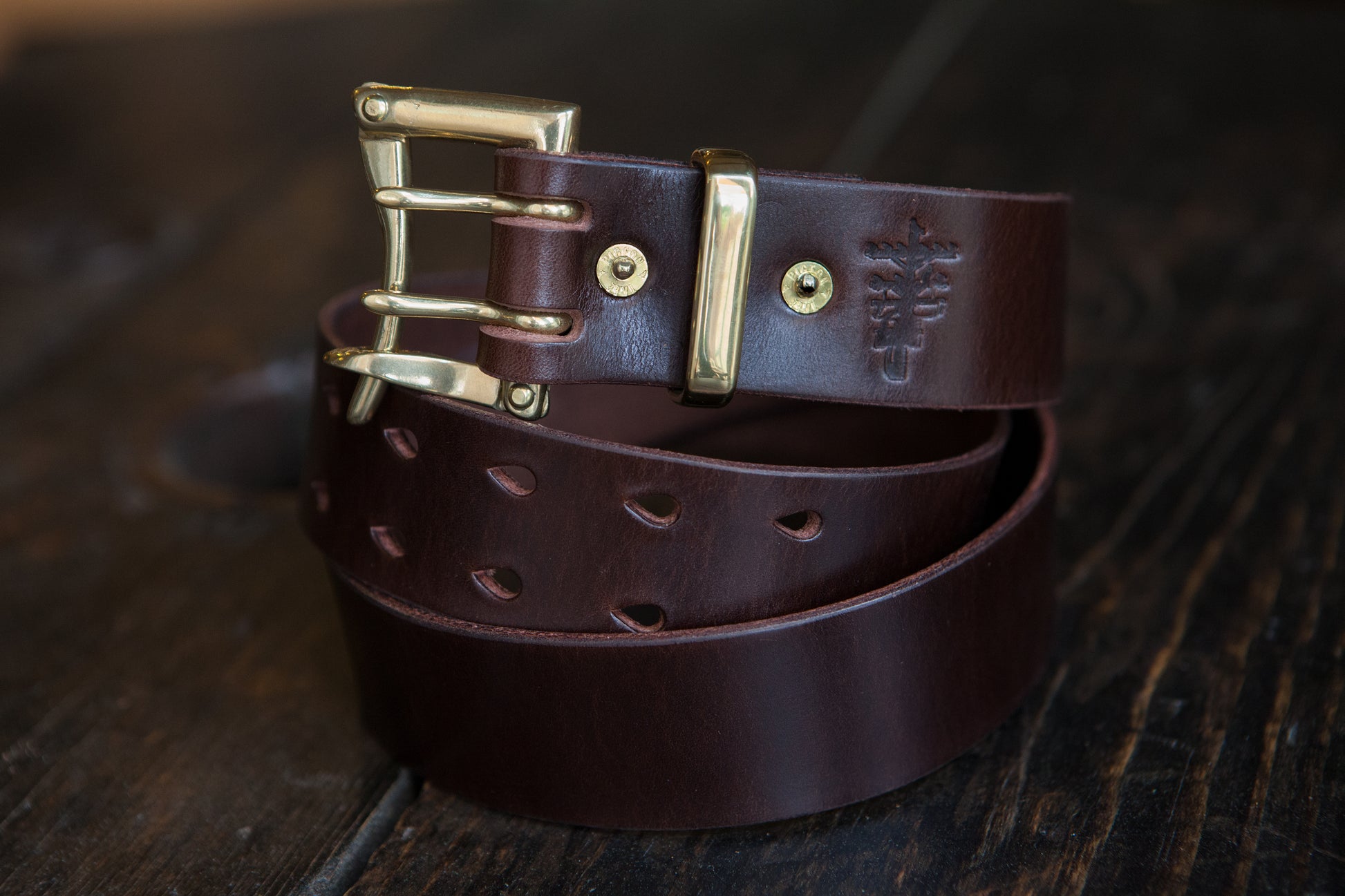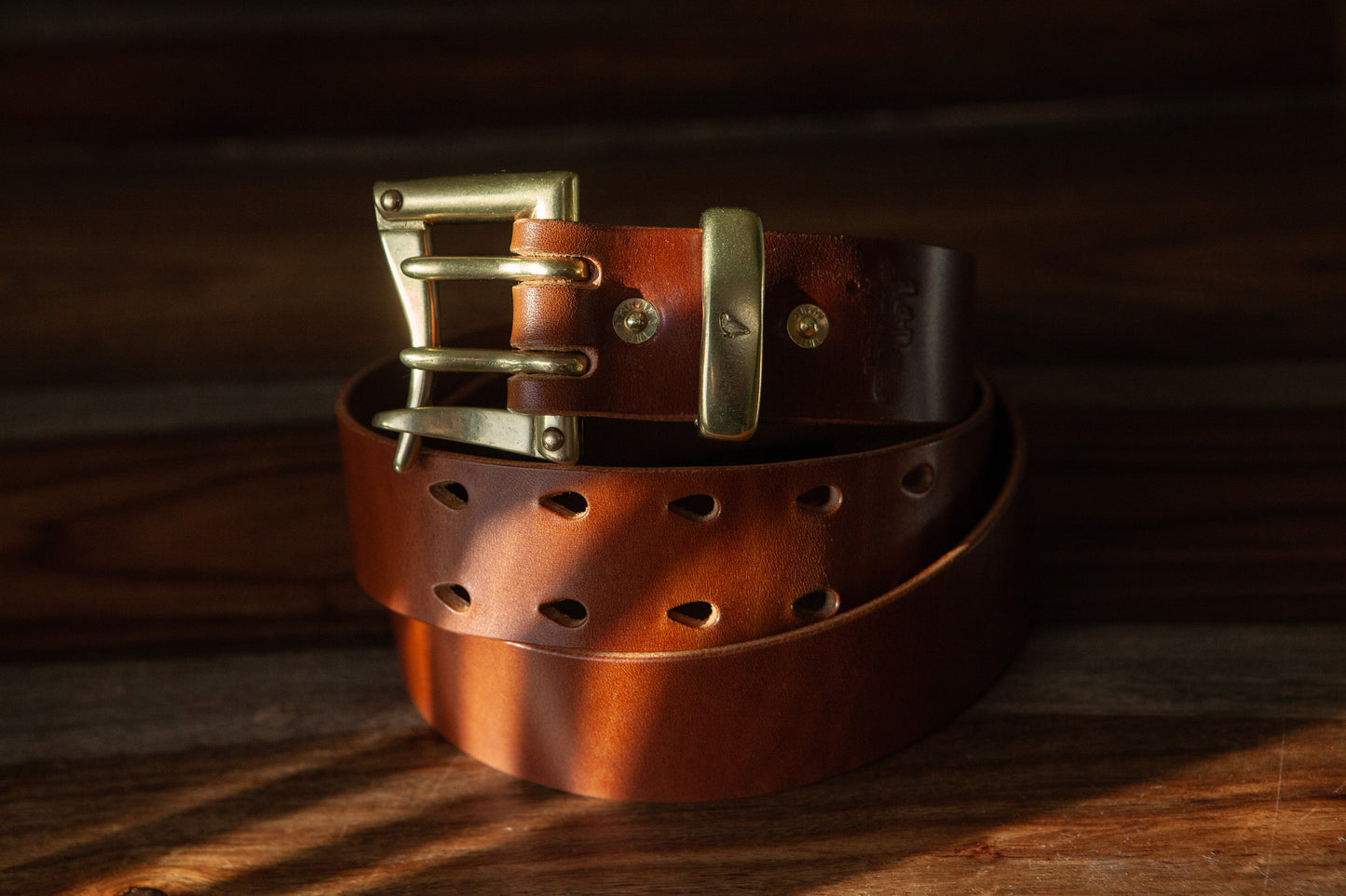 All quick release belts are made with teardrop holes, which besides the aesthetic difference, will allow the buckle to lie slightly more flat than a round hole, due to the oblong shape of the hole. Hardware will be secured with Pigeon Tree branded rivets for the brass option, while black nickel will be stitched with tonal thread, and nickel will be secured with nickel Chicago screws.
