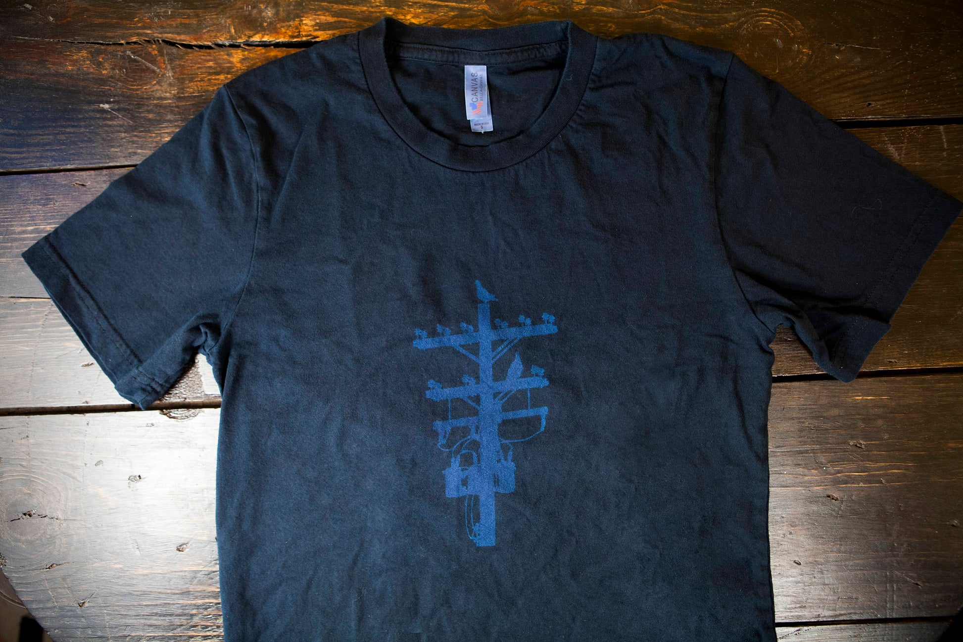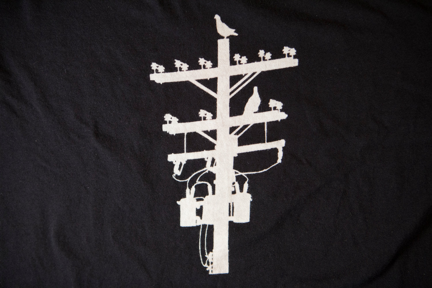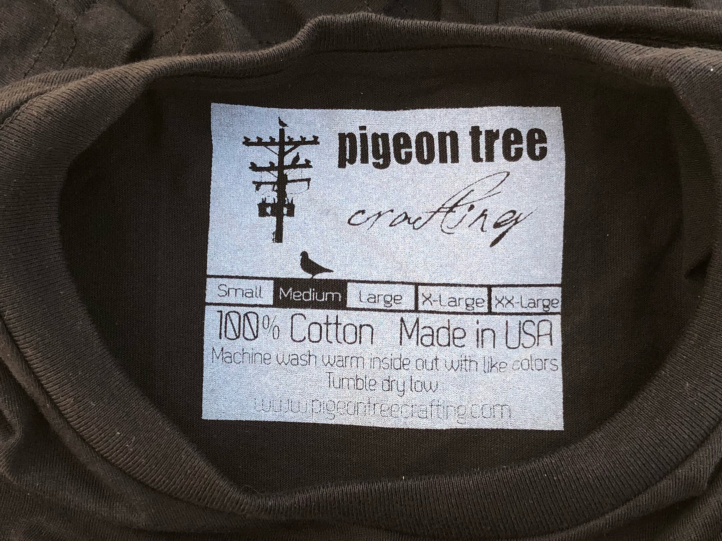 Made in the USA 100% cotton T-shirts. Black with a discharged white Pigeon Tree logo.