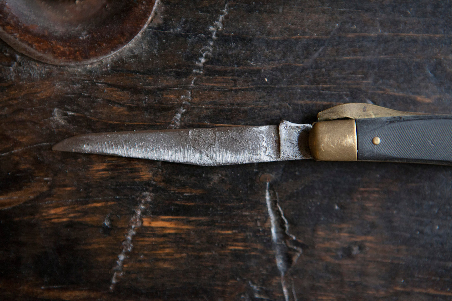 Vintage Sears Craftsman 95074 LockBlade Trapper pocket knife, in good working condition. The blade is in rough shape, with lots of pitting, but no rusting, it is relatively sharp and can be sharpened further. The brass locking mechanism works but the blade has some wiggle to it when extended.