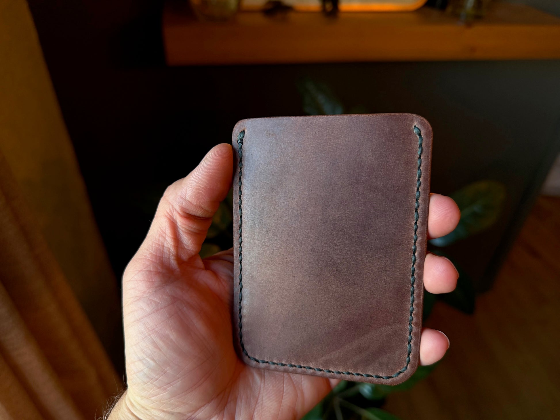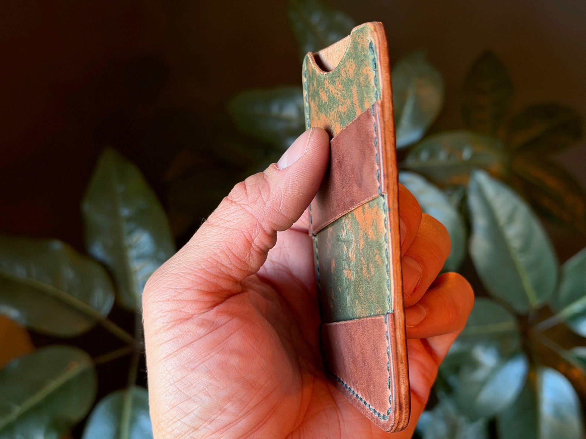 A while back I got my hands on some beautiful marbled shell cordovan from Italy and I happened to come across a small amount that I had left. Made with a combination of brown and green shell, and hand saddle-stitched together with green ritza tiger thread.