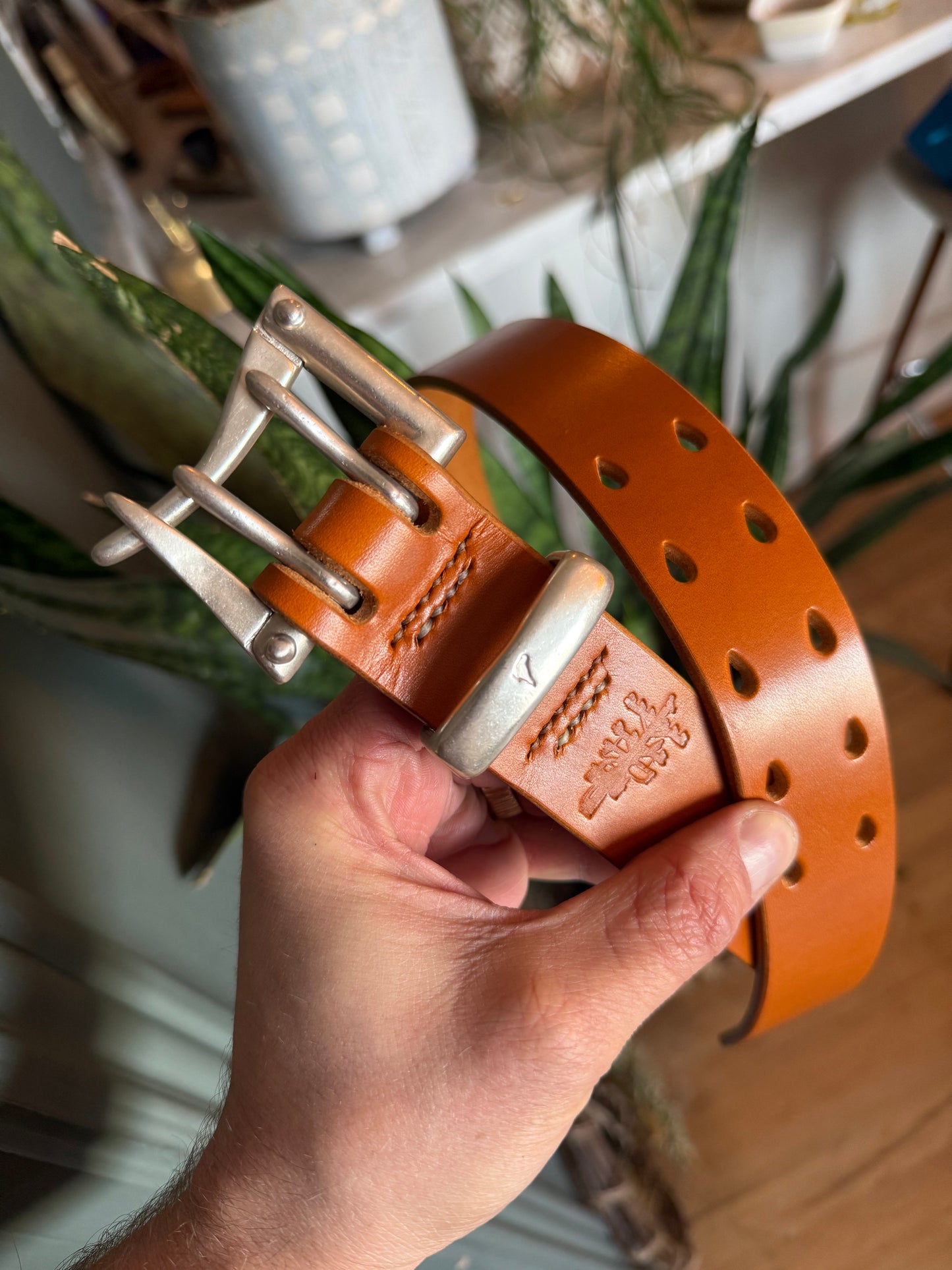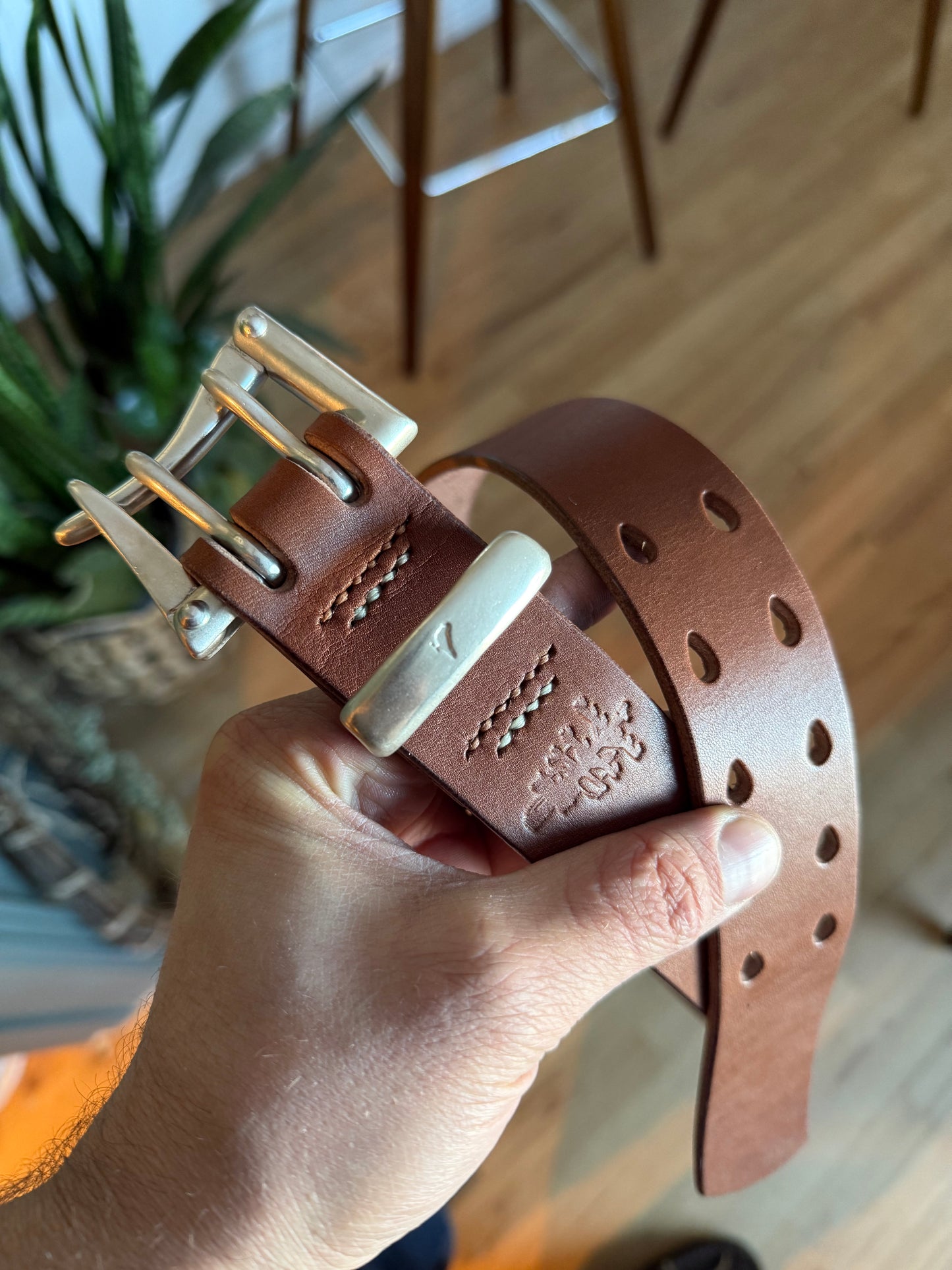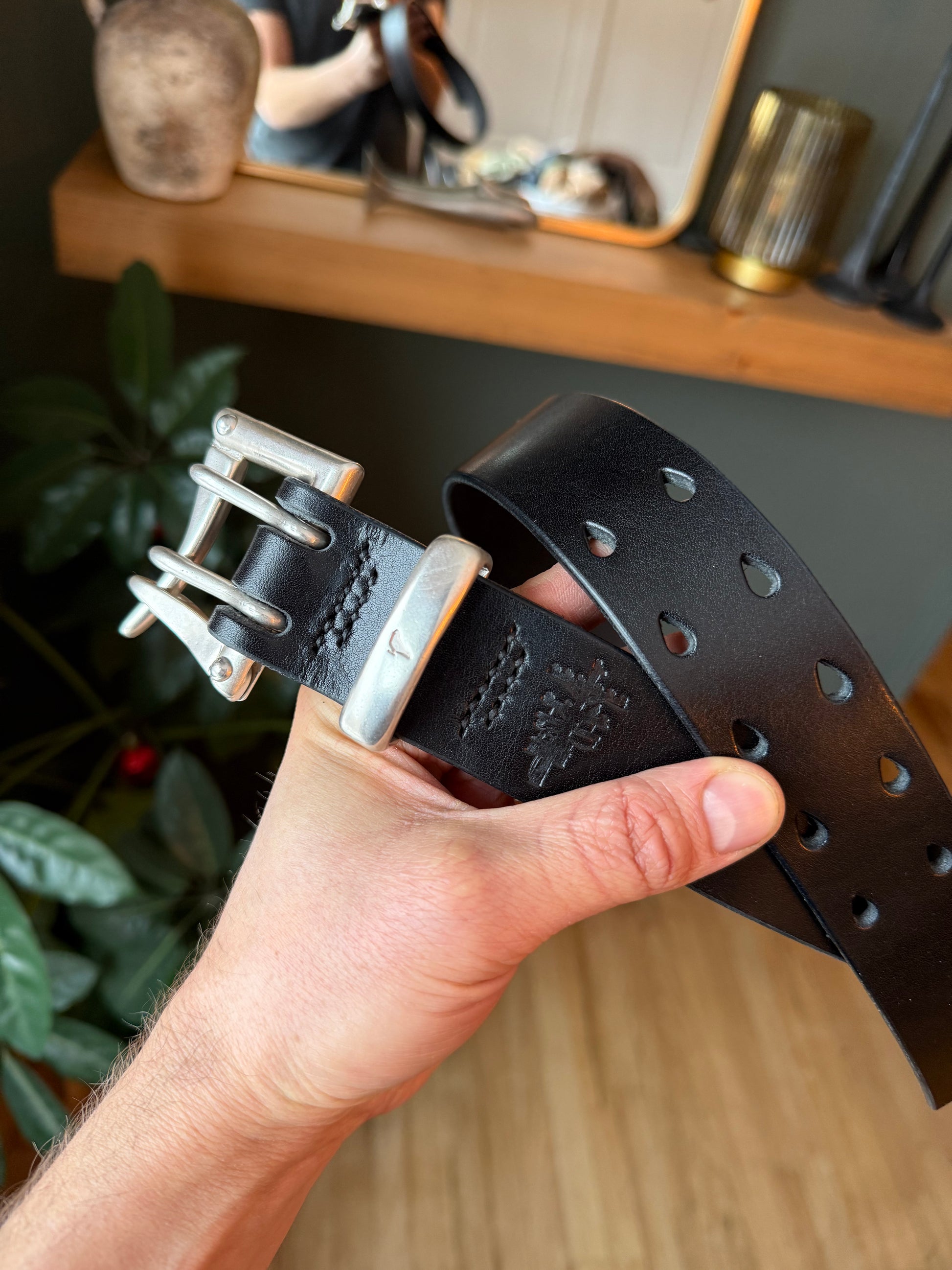 The buckle and keeper are both cast in solid .925 sterling silver, I have hand polished each piece to a dull sheen so that they are ready to develop an amazing patina. Though these belts are highly limited and exclusive, they are not numbered. However, this is a special release, so I will be using my signature double row hand-stitching method to secure the hardware.