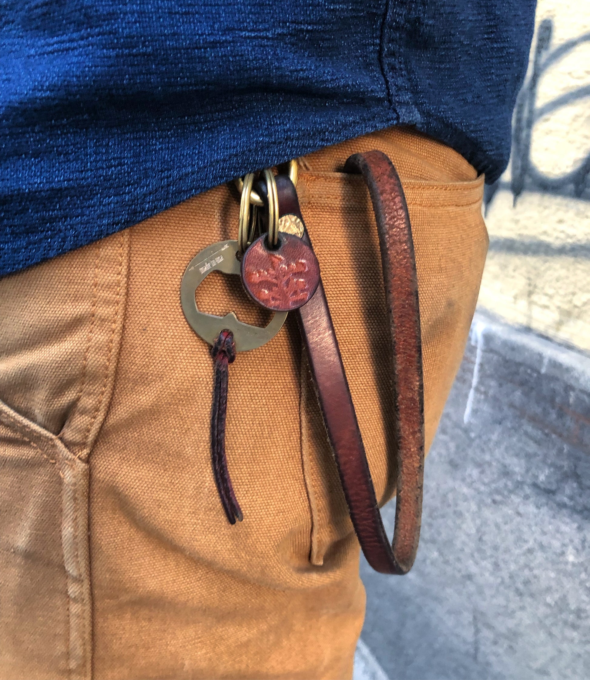 The 9-10oz Hermann Oak natural leather that this lanyard is made from will develop patina with use, darkening with exposure to the sun and the elements, as well as the oil from your hands.