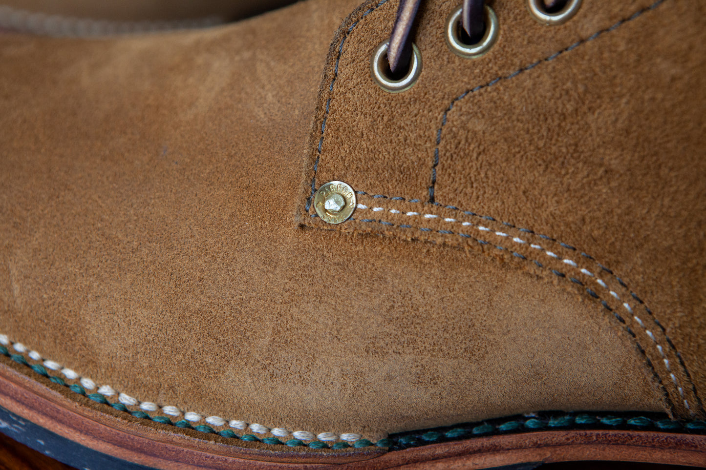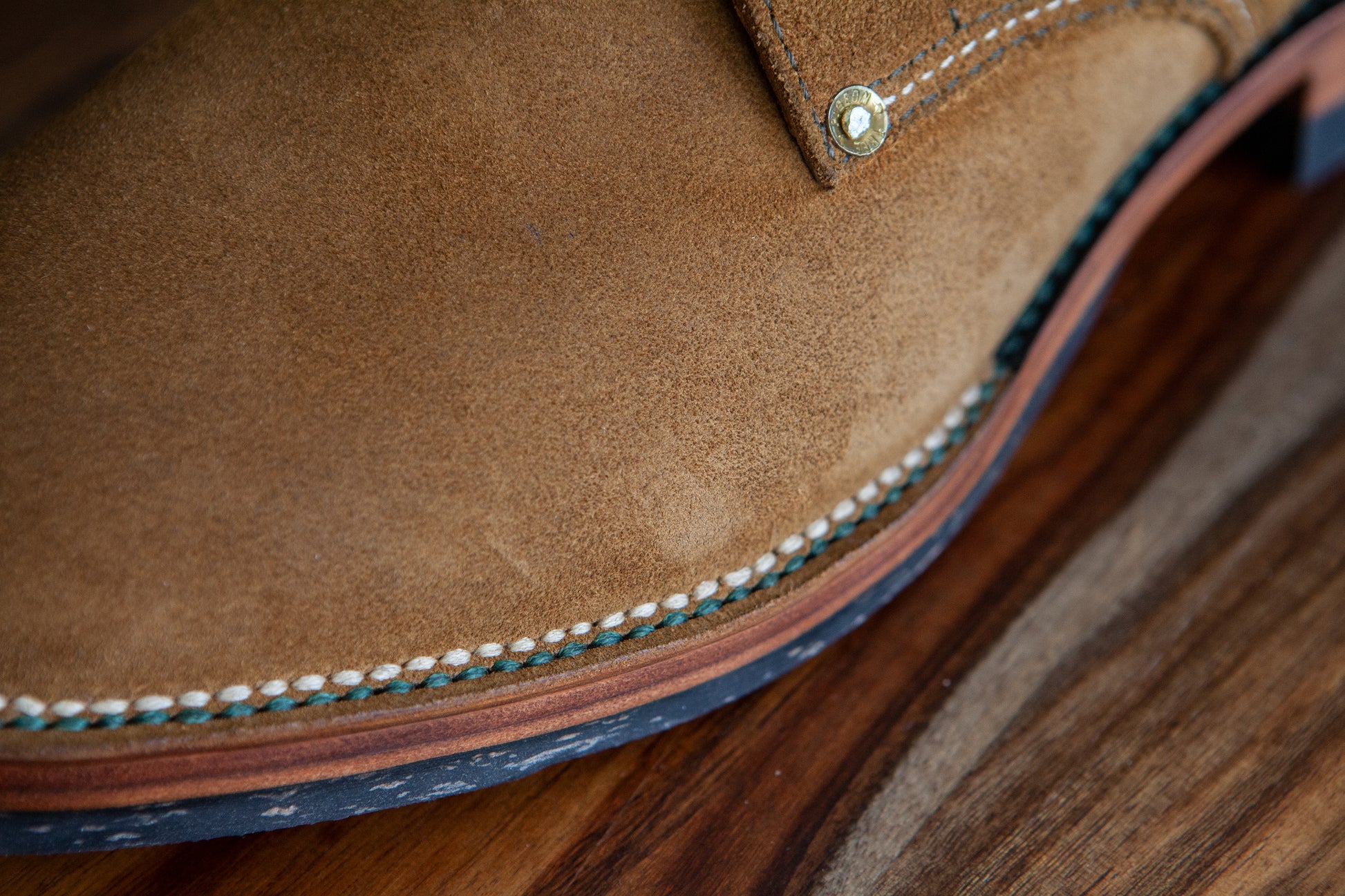 • Hand-Stitched Veldtschoen Construction (it's like stitchdown and goodyear welt had a baby) with two-tone dark olive & cream colored thread.