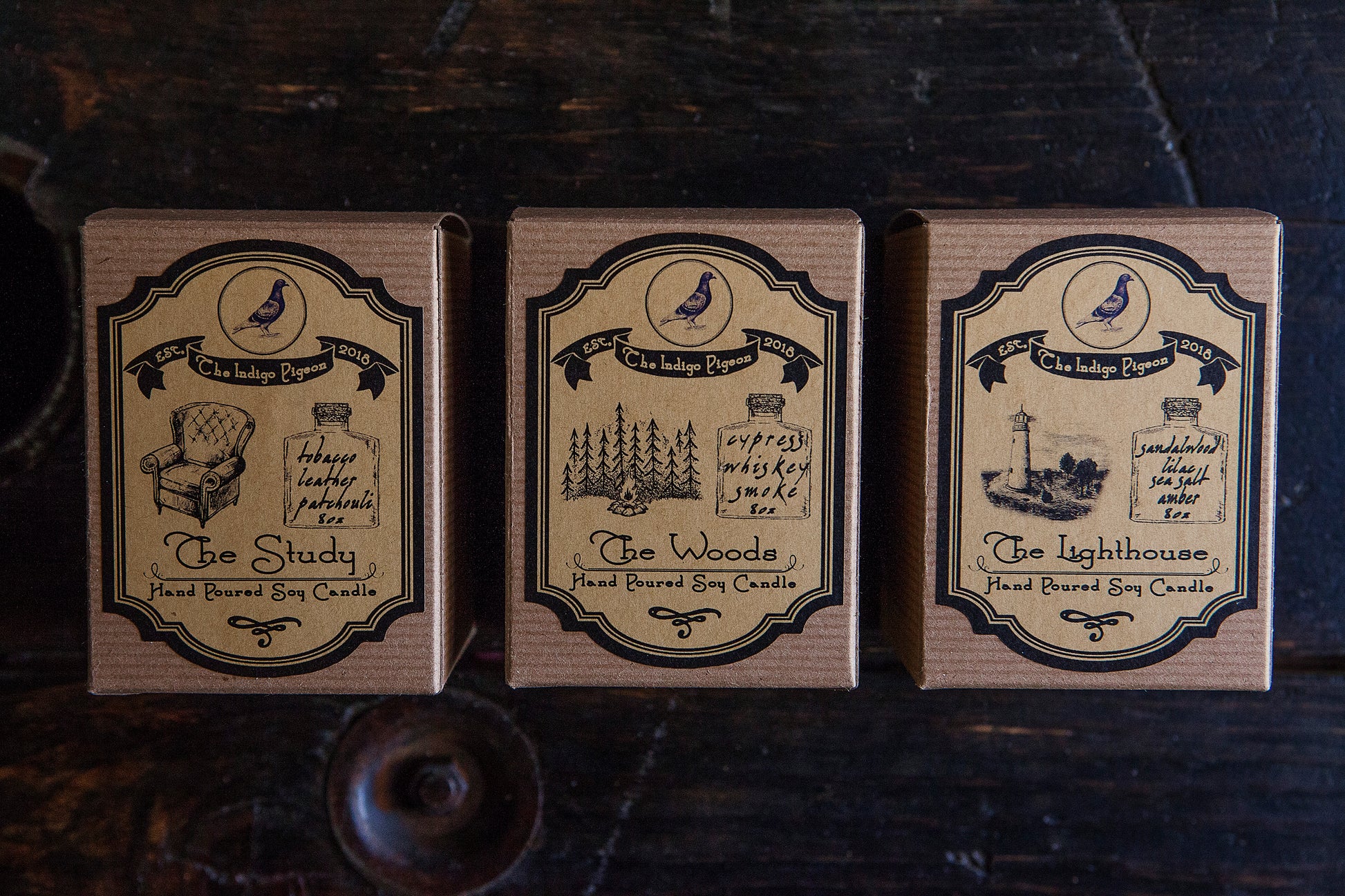"The Indigo Pigeon" by Pigeon Tree Crafting is a three part series of candles that are connected by a dark mystery. Within each candle's packaging, you will find a wax-sealed envelope that contains a letter. Take heed; this story is not for the faint of heart.