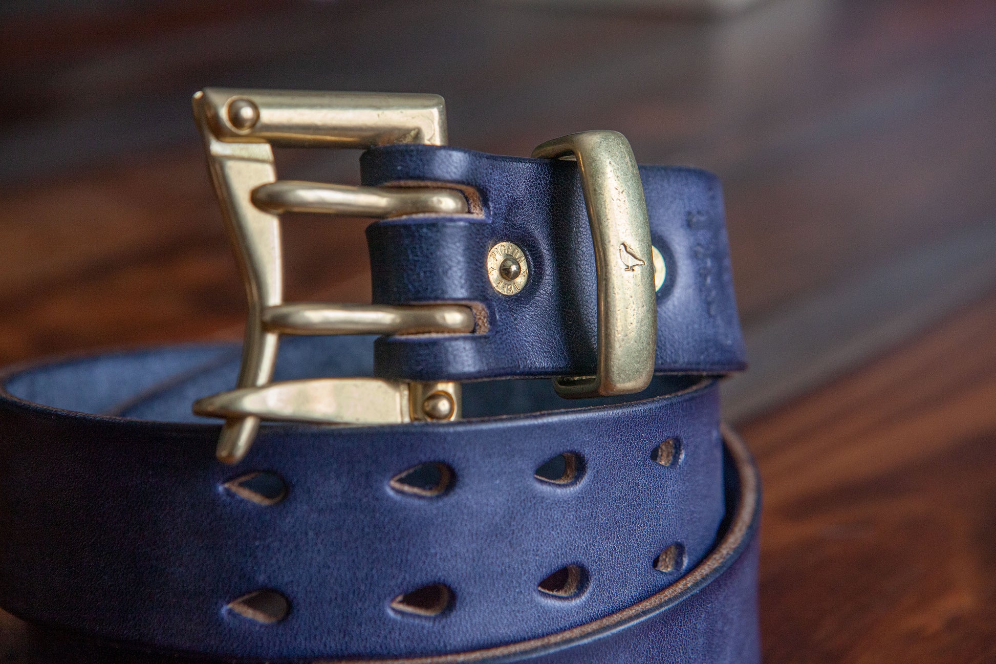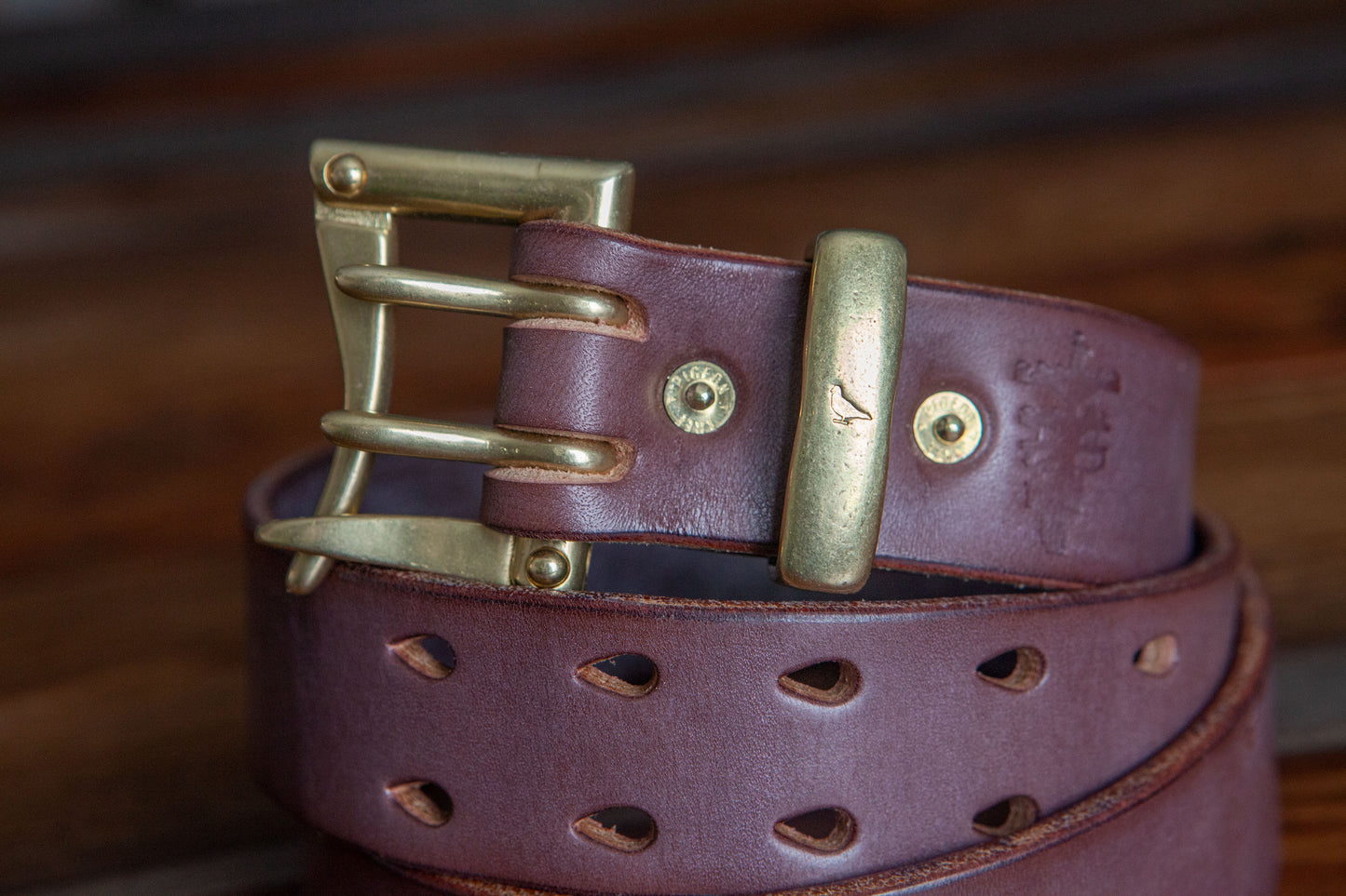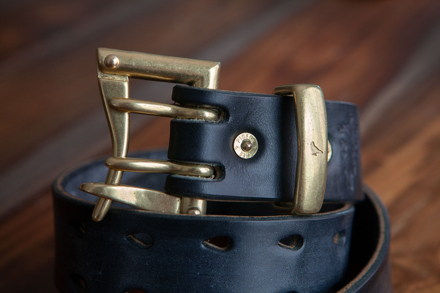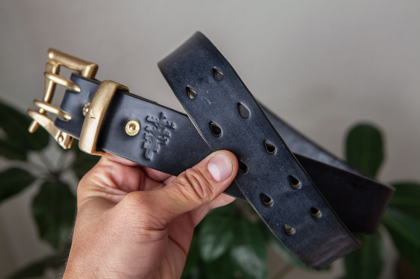 All quick release belts are made with teardrop holes, which besides the aesthetic difference, will allow the buckle to lie slightly more flat than a round hole, due to the oblong shape of the hole. Hardware will be secured with Pigeon Tree branded rivets for the brass hardware option, while black nickel will be stitched with tonal thread, and nickel will be secured with nickel Chicago screws.
