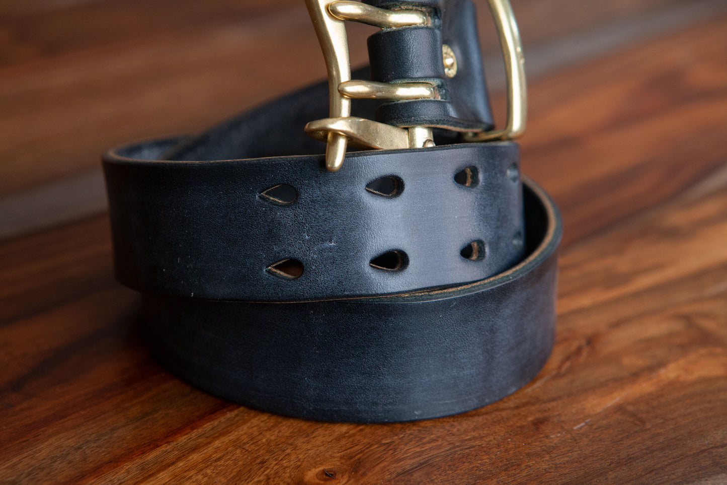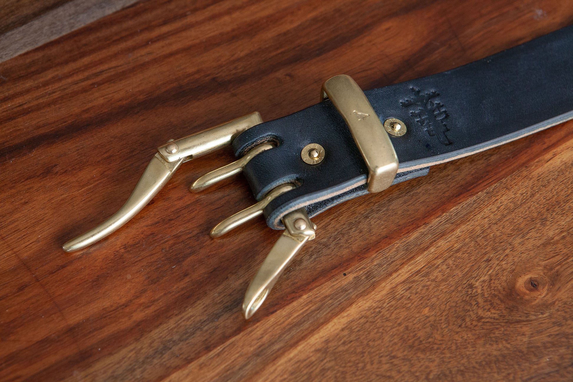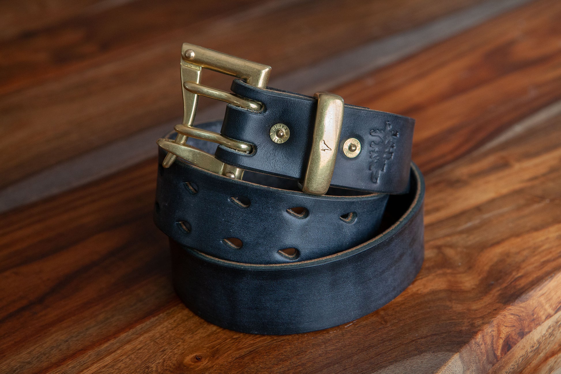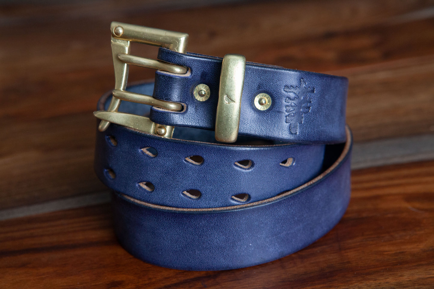 All quick release belts are made with teardrop holes, which besides the aesthetic difference, will allow the buckle to lie slightly more flat than a round hole, due to the oblong shape of the hole. Hardware will be secured with Pigeon Tree branded rivets for the brass hardware option, while black nickel will be stitched with tonal thread, and nickel will be secured with nickel Chicago screws.