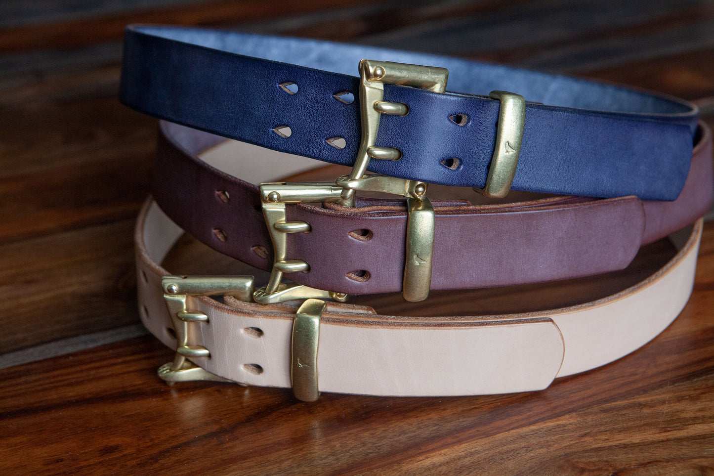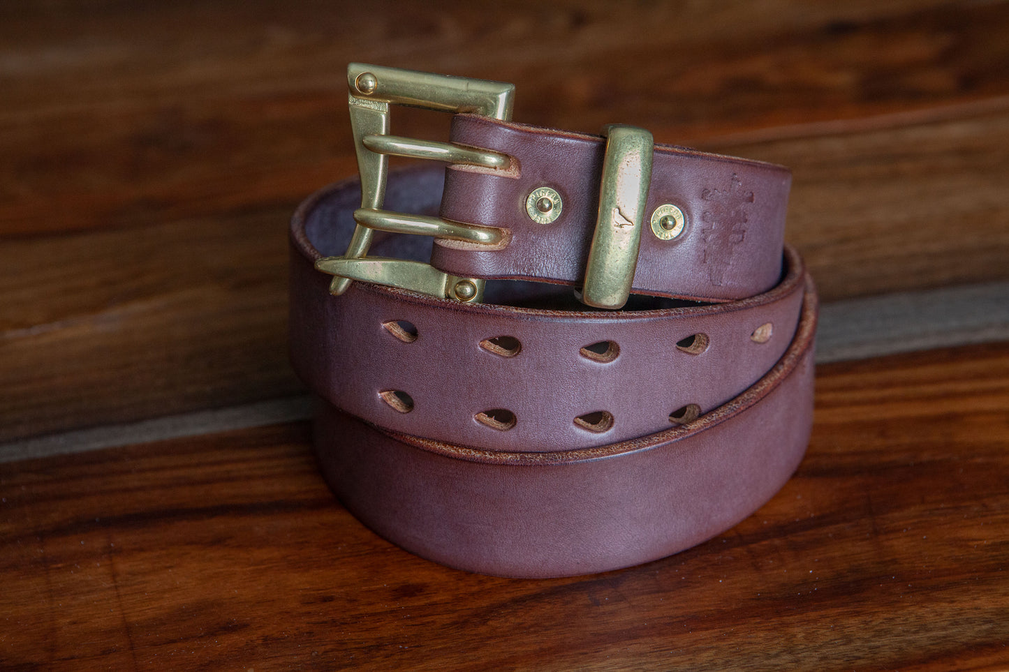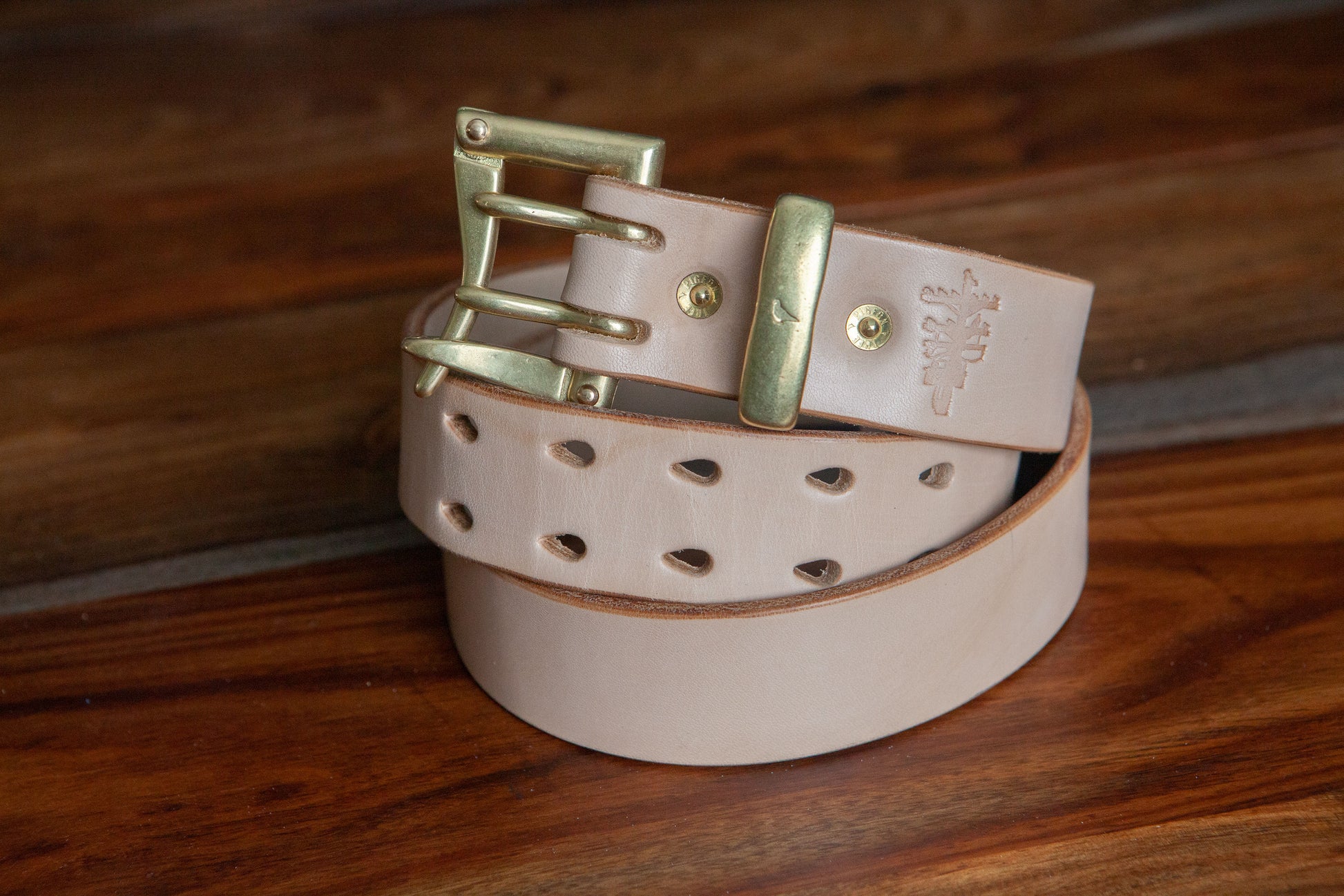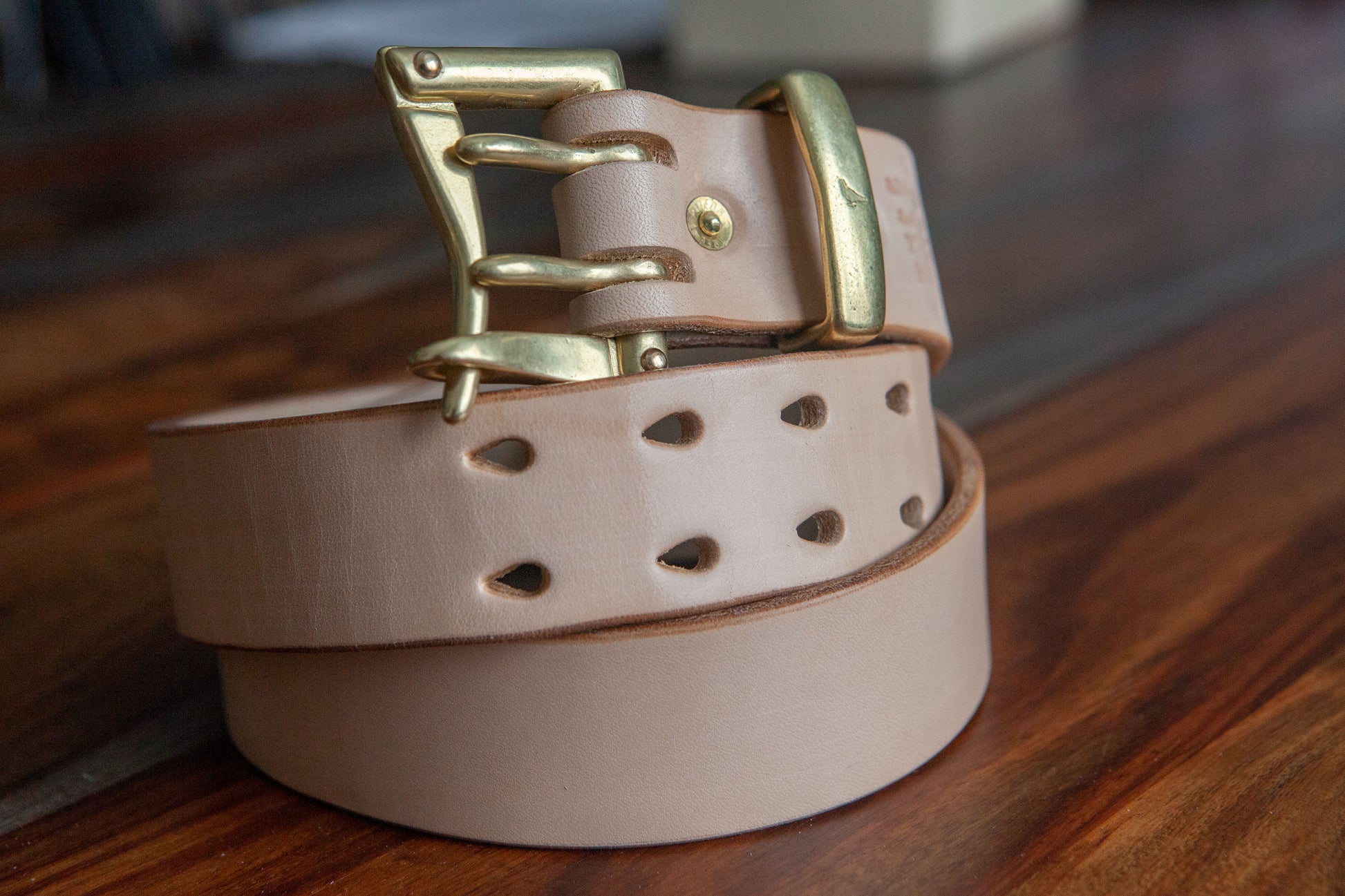 All quick release belts are made with teardrop holes, which besides the aesthetic difference, will allow the buckle to lie slightly more flat than a round hole, due to the oblong shape of the hole. Hardware will be secured with Pigeon Tree branded rivets for the brass hardware option, while black nickel will be stitched with tonal thread, and nickel will be secured with nickel Chicago screws.